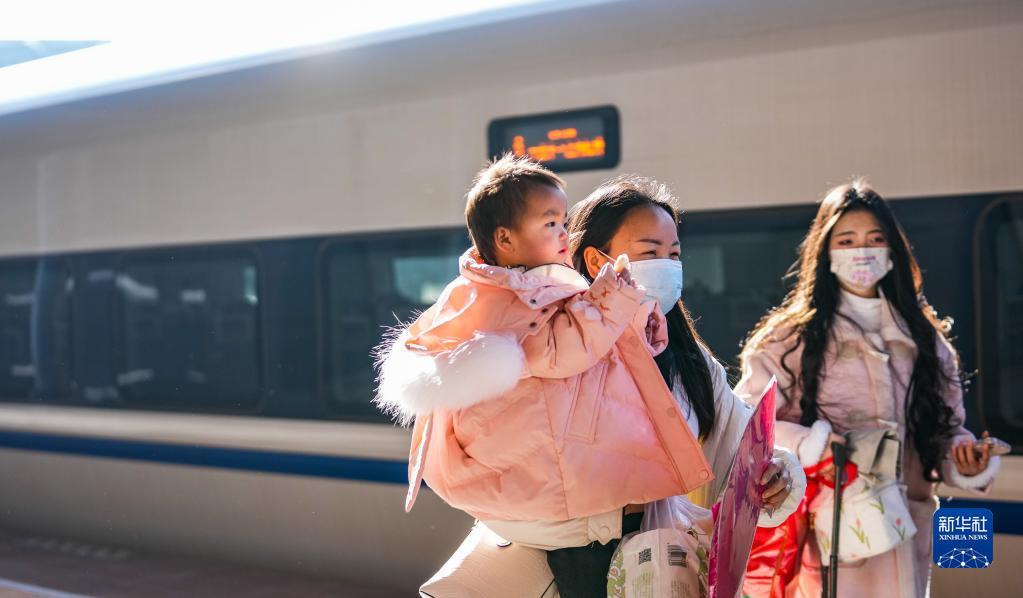 1月7日,在貴州六盤(pán)水站,小朋友和家人準備乘車(chē)。