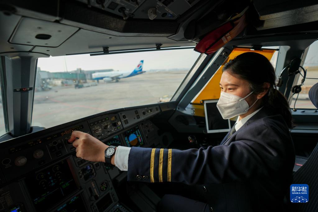 1月6日,重慶航空客機駕駛艙內,擔任副駕駛的楊靜協(xié)助她所在航班機長(cháng)進(jìn)行駕駛艙內的起飛前準備工作。