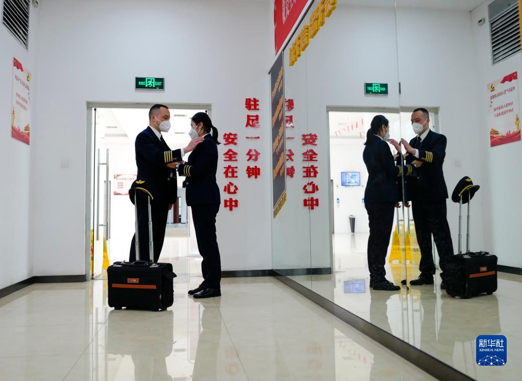 1月6日,重慶航空的機組工作區內,先出發(fā)的菅士博(左)在向妻子楊靜(右)告別。