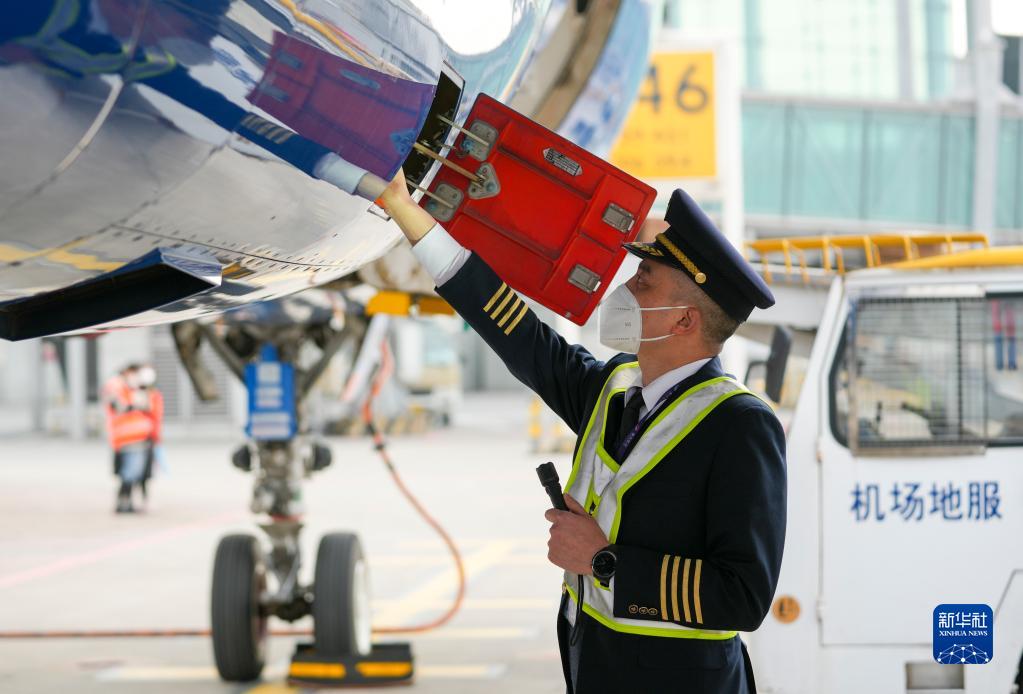 1月6日,重慶江北國際機場(chǎng)的停機坪上,機長(cháng)菅士博對客機進(jìn)行起飛前的繞機檢查。