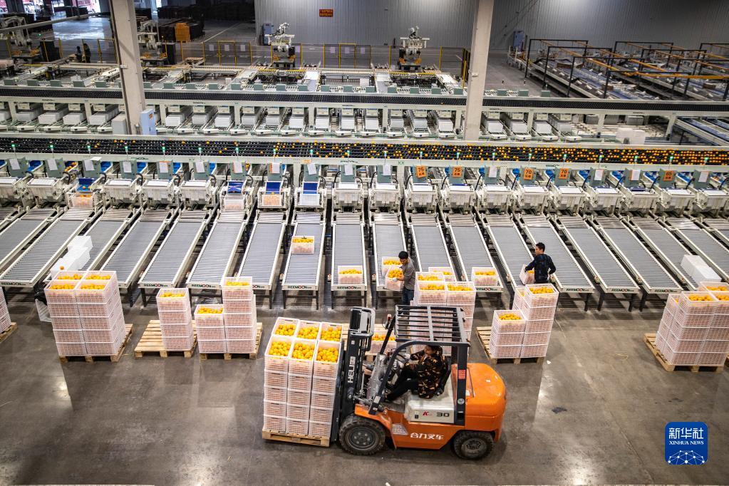 1月6日,工作人員在中國三峽柑橘(奉節臍橙)交易中心搬運經(jīng)全自動(dòng)分揀線(xiàn)分選的臍橙。