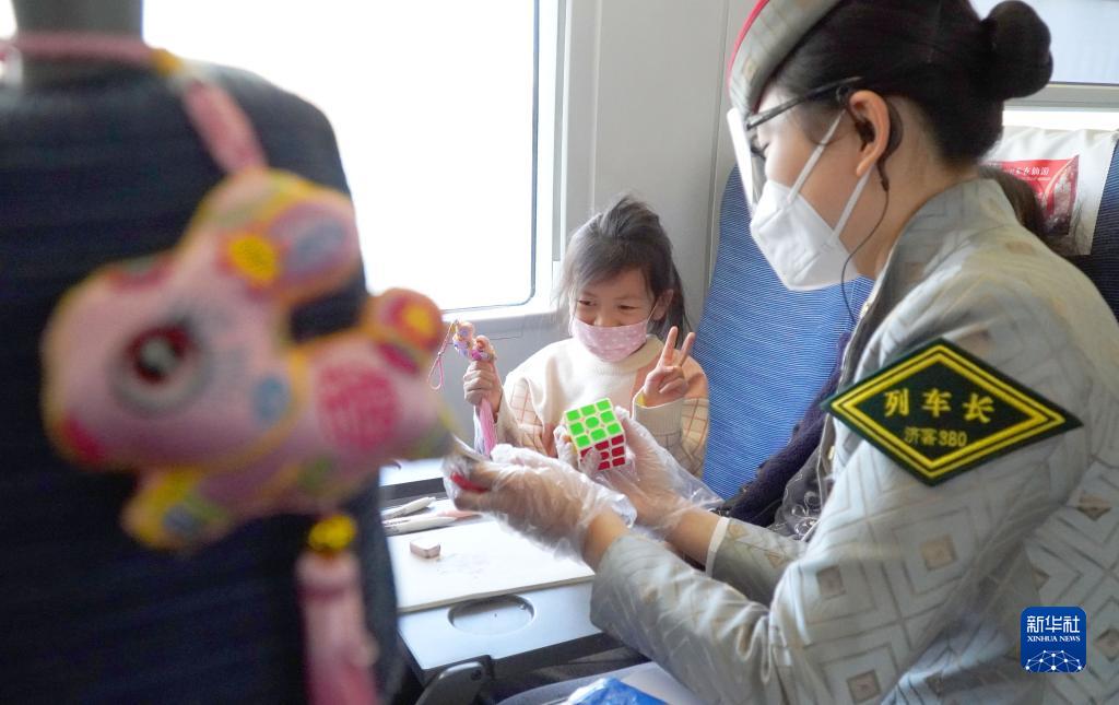 1月7日,在G105次列車(chē)上,列車(chē)長(cháng)馬文麗為一名小朋友的座位掛上粉色小兔標記并與小朋友互動(dòng)。