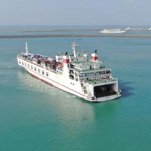 粵海鐵路輪渡是我國第一條跨海鐵路通道,跨越我國三大海峽之一的瓊州海峽?;浐hF路輪渡于2003年1月7日開(kāi)通營(yíng)運,海上航線(xiàn)距離約12.5海里(相當于22.5公里),航行時(shí)間約60分鐘?,F有四艘萬(wàn)噸級渡輪,較大的兩艘總噸位達2.3萬(wàn)噸。渡船下層甲板載運火車(chē),中層甲板載運汽車(chē),上層艙室載運旅客。