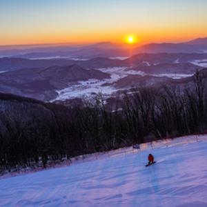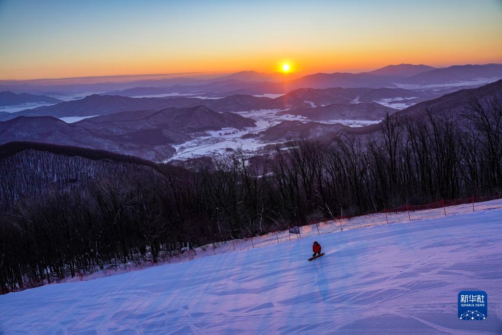 在吉林省吉林市萬(wàn)科松花湖度假區,滑雪愛(ài)好者在清晨第一縷陽(yáng)光下滑雪(2023年1月1日攝)。