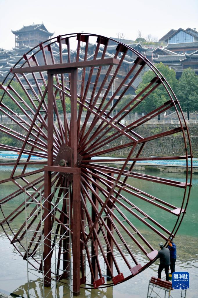 春節臨近,在湖北省恩施土家族苗族自治州宣恩縣城興隆老街前,多架大型農耕水車(chē)正加緊安裝。安裝好的水車(chē),將成為展示少數民族農耕文化的風(fēng)景線(xiàn)。