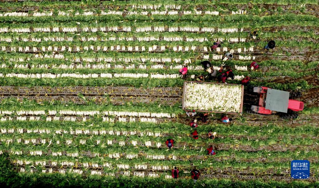 1月8日,村民在四川省眉山市青神縣青竹街道沙河村采收反季節蘿卜(無(wú)人機照片)。