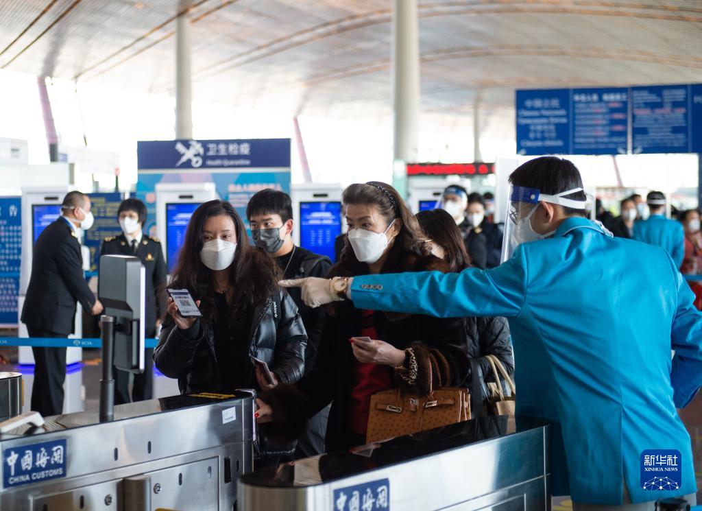1月8日,首都國際機場(chǎng)工作人員引導入境旅客掃“旅客健康申報二維碼”后通過(guò)海關(guān)閘機。