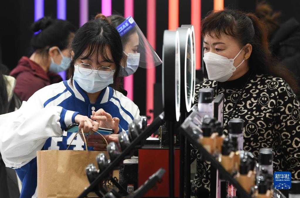1月8日,游客在中免集團??谌赵聫V場(chǎng)免稅店選購免稅商品。