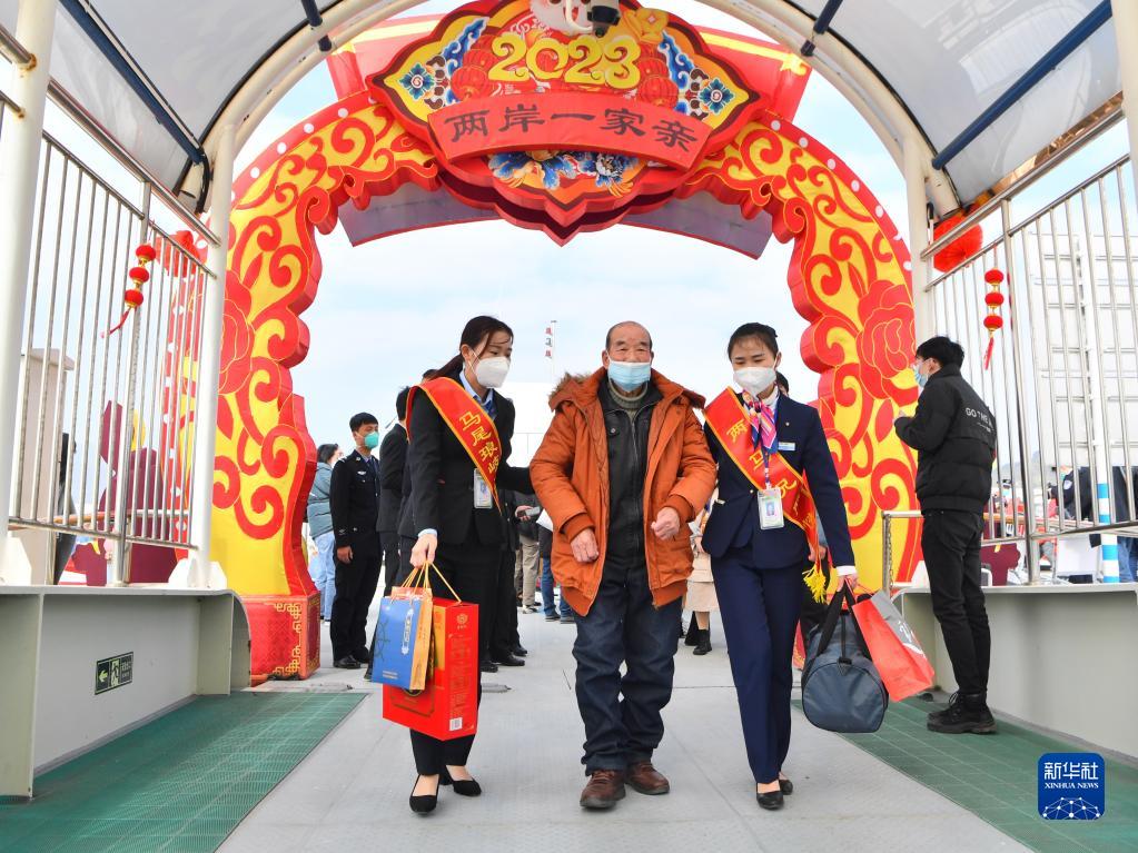 1月8日,在福州馬尾瑯岐碼頭,工作人員協(xié)助抵達的臺胞前往邊檢大廳。