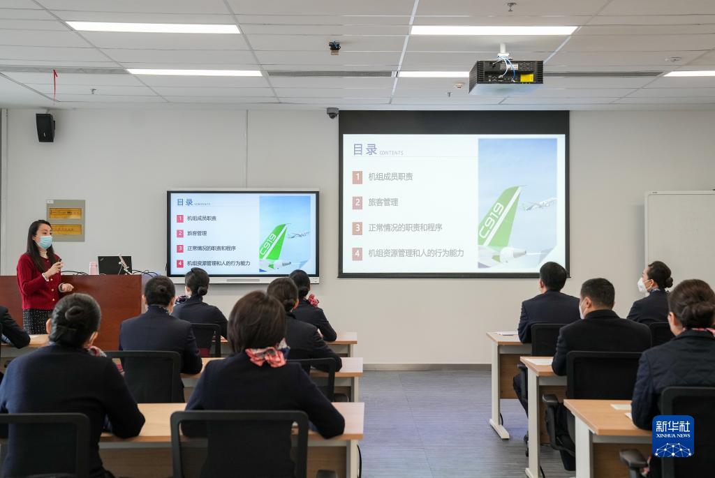 在中國商飛上海飛機客戶(hù)服務(wù)有限公司,東航的C919飛機乘務(wù)員在接受培訓(1月6日攝)。