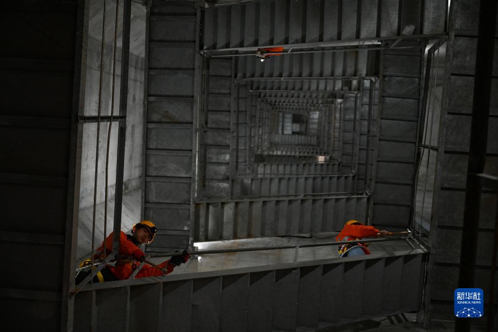 1月8日,在福建平潭公鐵兩用跨海大橋,福州工務(wù)段工作人員在大橋主塔內部進(jìn)行敲擊檢查作業(yè)。