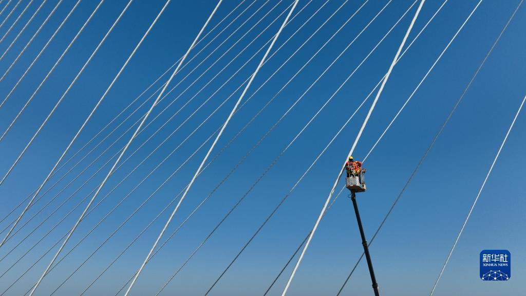 1月8日,在福建平潭公鐵兩用跨海大橋,福州工務(wù)段工作人員在高空對大橋斜拉索作業(yè)(無(wú)人機照片)。