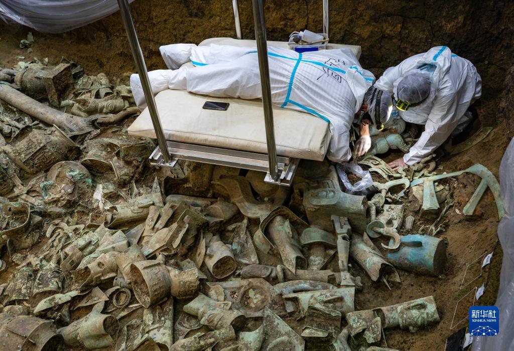 2022年6月1日,在位于四川廣漢的三星堆遺址8號“祭祀坑”,8號“祭祀坑”發(fā)掘負責人、北京大學(xué)考古文博學(xué)院副教授趙昊(左)與考古工作者任俊鋒一起清理銅神壇。