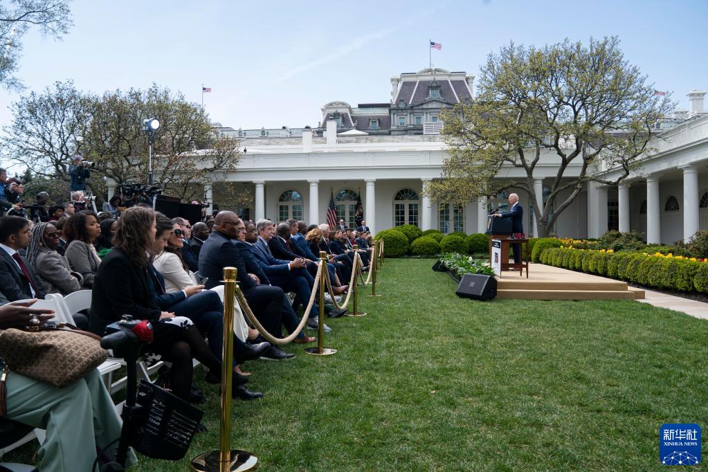 2022年4月11日,美國總統拜登(右一)在華盛頓白宮就監管“幽靈槍”的新規發(fā)表講話(huà)。美國聯(lián)邦政府當日出臺新規,著(zhù)眼監管無(wú)編號且難以追蹤的“幽靈槍”。2022年,美國有近4.4萬(wàn)人死于槍支暴力。