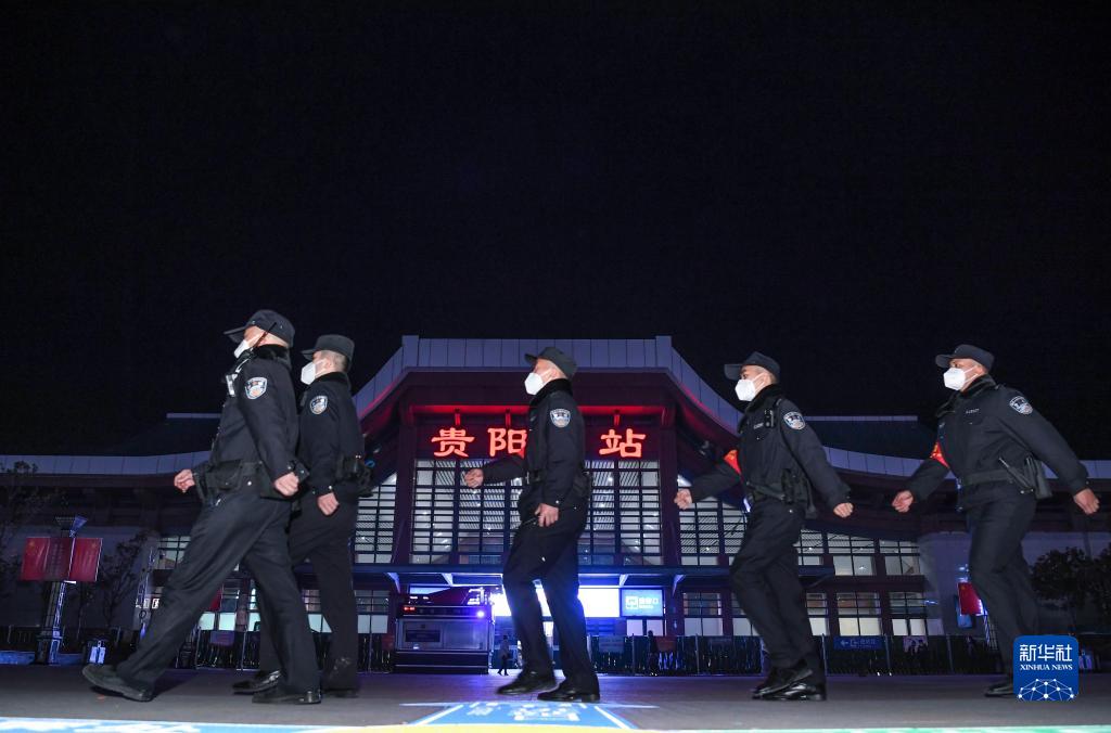 1月8日,鐵路警察王云(左一)和謝源(左二)與其他執勤民警在貴陽(yáng)東站進(jìn)行站區巡查。