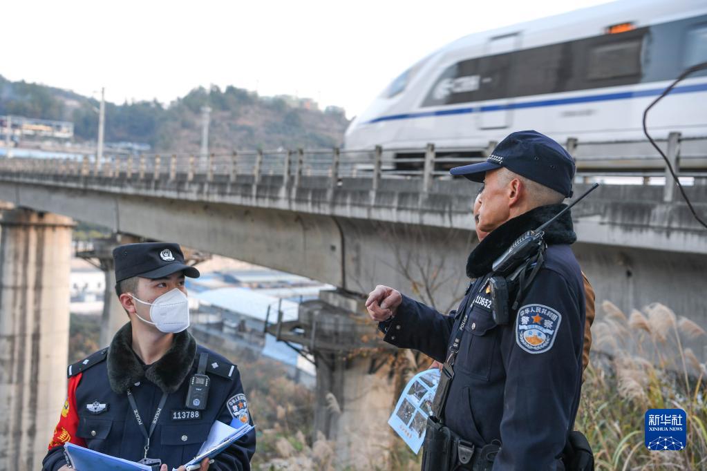 1月8日,鐵路警察王云(右)和謝源在鐵路沿線(xiàn)進(jìn)行線(xiàn)路安全巡查。
