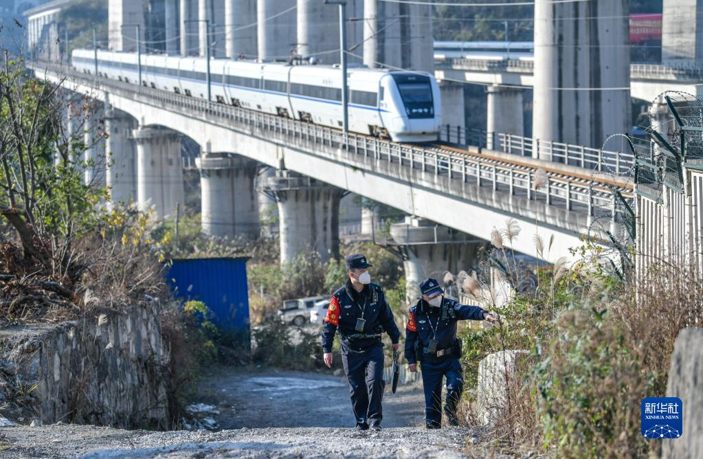 1月8日,鐵路警察王云(右)和謝源在鐵路沿線(xiàn)進(jìn)行線(xiàn)路安全巡查。