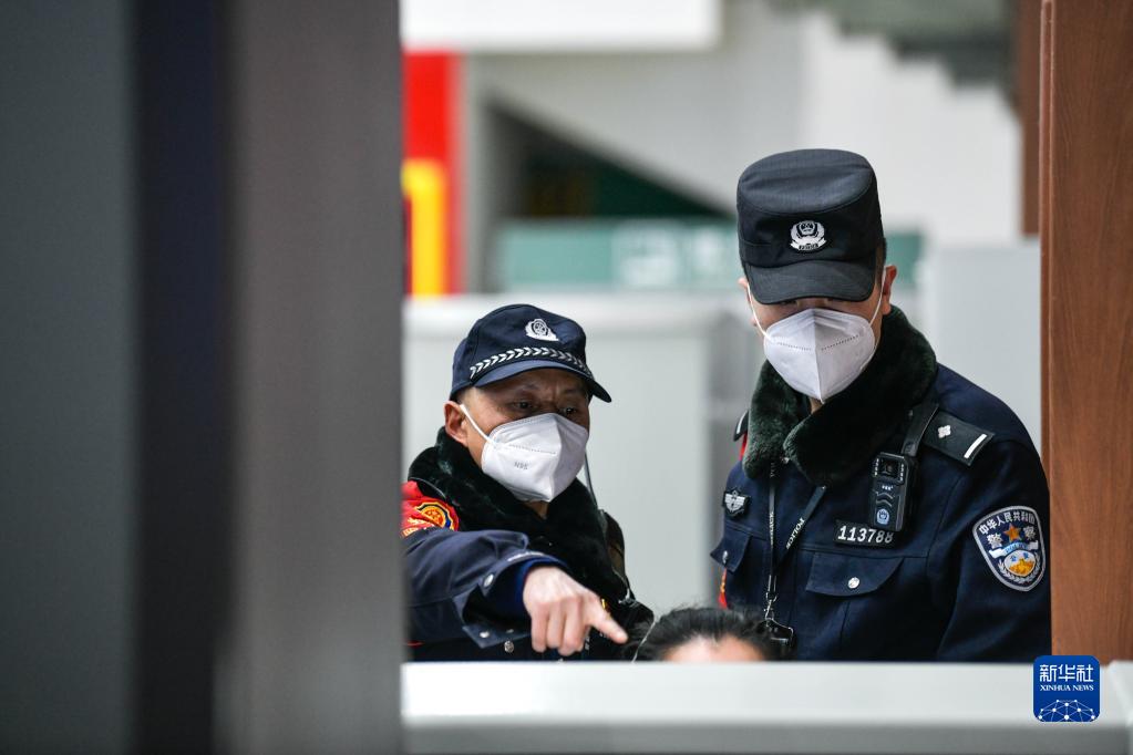 1月8日,鐵路警察王云(左)和謝源在貴陽(yáng)東站督導旅客進(jìn)站安檢情況。