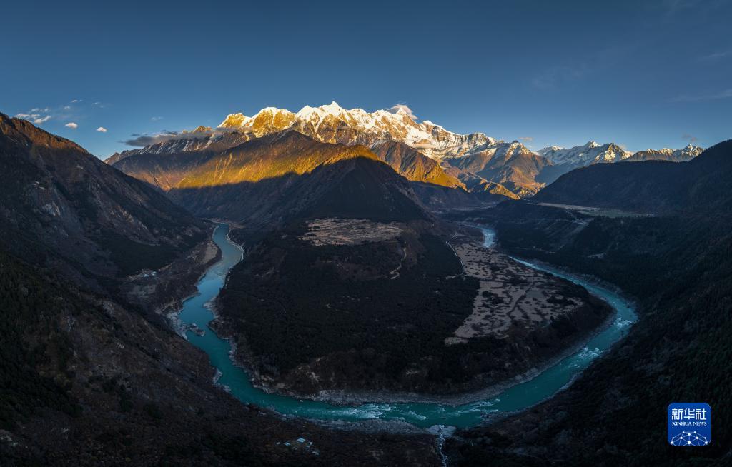 這是2022年11月28日拍攝的流淌在南迦巴瓦峰腳下的雅魯藏布江(無(wú)人機合成照片)。