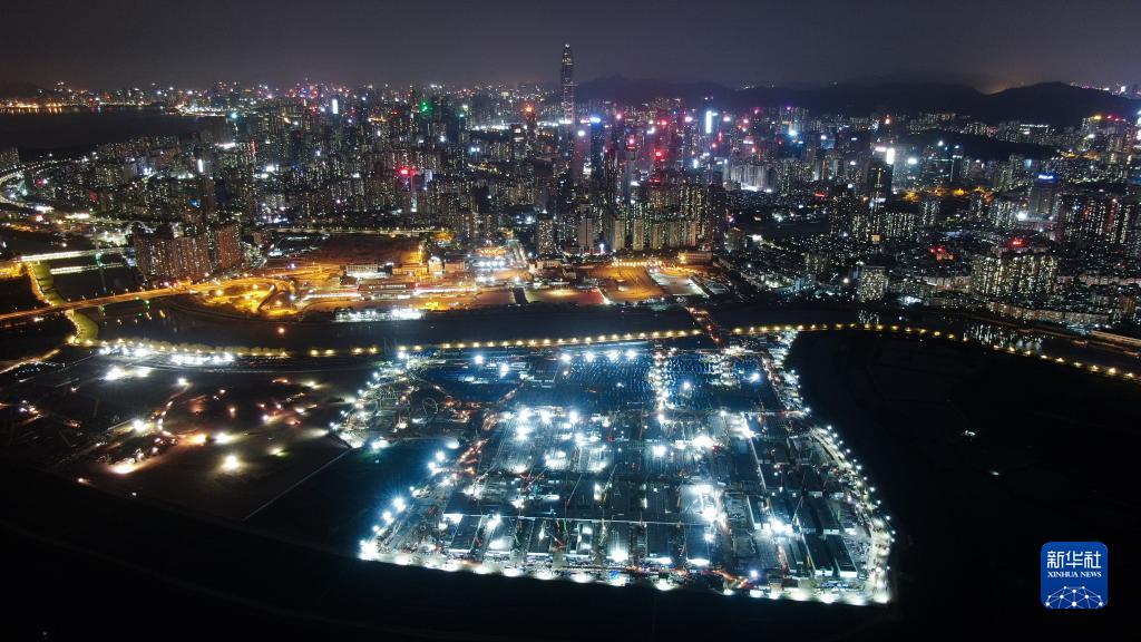2022年3月17日,中央援港應急醫院建設工地燈火通明(無(wú)人機照片)。2022年4月7日,位于香港落馬洲河套地區的中央援港應急醫院項目一期工程按期完工并通過(guò)驗收。兩萬(wàn)余名來(lái)自五湖四海的建設者發(fā)揚“同胞有難、義不容辭”的精神逆行出征,經(jīng)過(guò)30天爭分奪秒日夜奮戰,在一片荒灘上建起“生命之舟”。