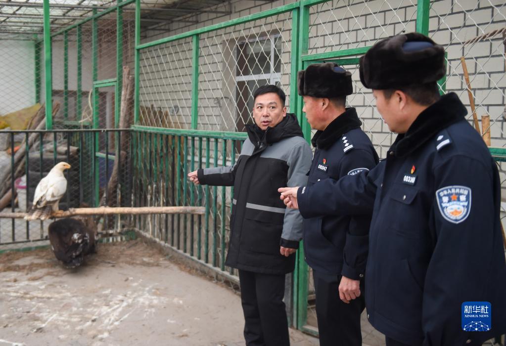 1月9日,西烏珠穆沁旗公安局古日格斯臺國家級自然保護區迪彥派出所民警王東濤(中)和呼德格琴(右)在古日格斯臺國家級自然保護區救助站中看望前不久救助的草原雕。