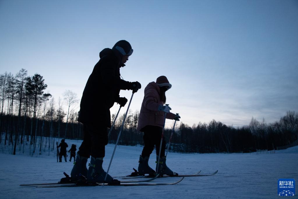 1月7日,游客在漠河市北極村滑雪場(chǎng)內體驗滑雪。