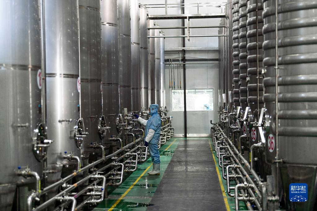 1月10日,在圍場(chǎng)縣一家沙棘深加工企業(yè)的沙棘冰酒釀造車(chē)間,工人檢查罐內儲酒。