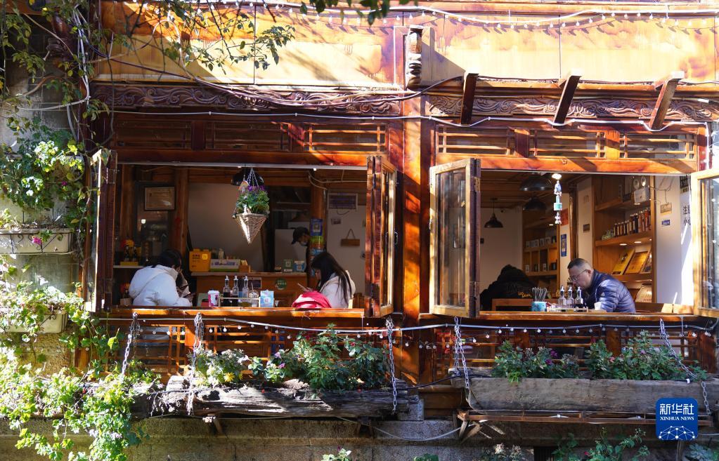 1月10日,游客在麗江古城休憩、吃飯。