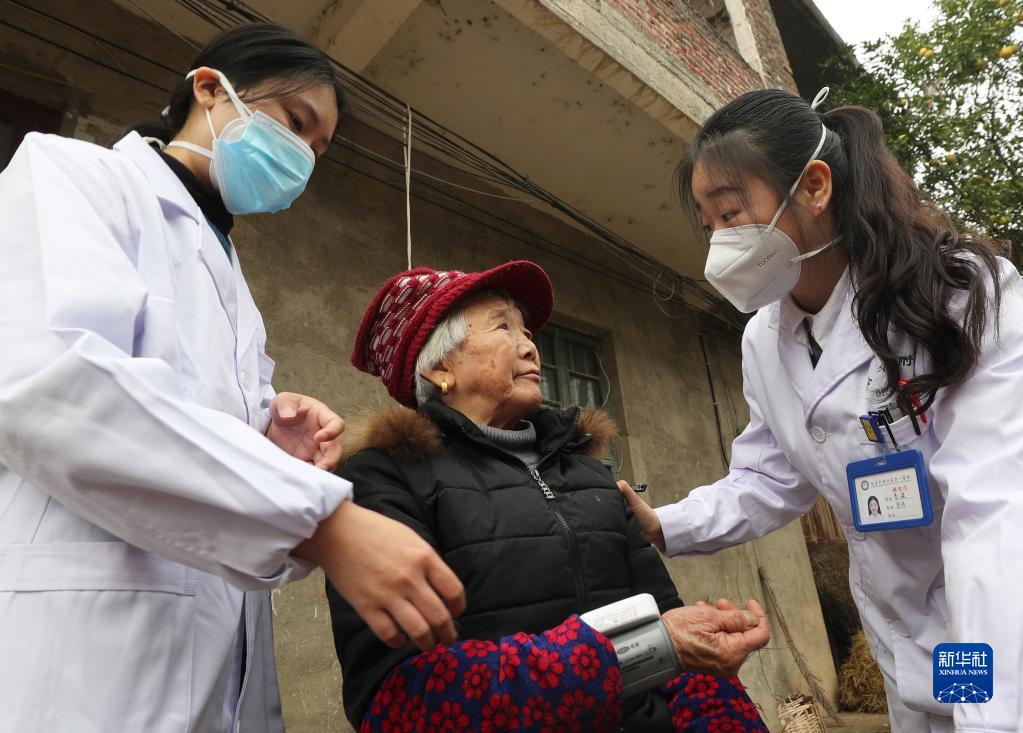 1月10日,在郴州市安仁縣渡口鄉長(cháng)灘村,來(lái)自南華大學(xué)第一臨床學(xué)院的研究生志愿者給當地村民測量血壓。