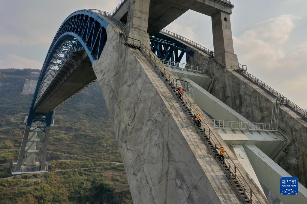 1月10日,貴陽(yáng)高鐵工務(wù)段工作人員在大橋上攀爬(無(wú)人機照片)。