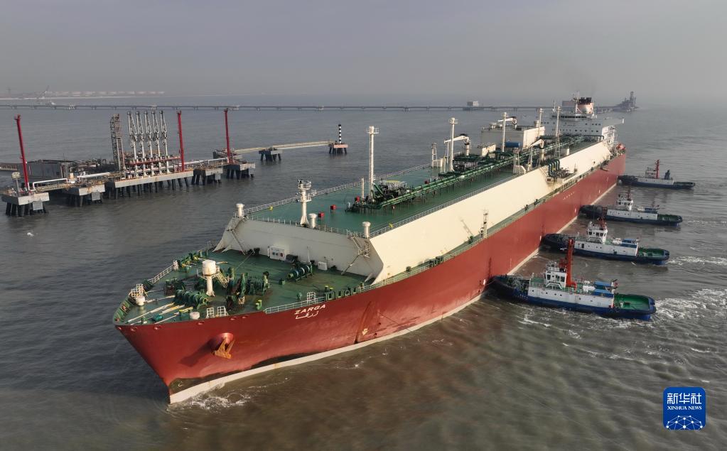 1月11日,一艘LNG船在拖輪的協(xié)助下向唐山港曹妃甸港區中石油液化天然氣接收站碼頭靠泊(無(wú)人機照片)。