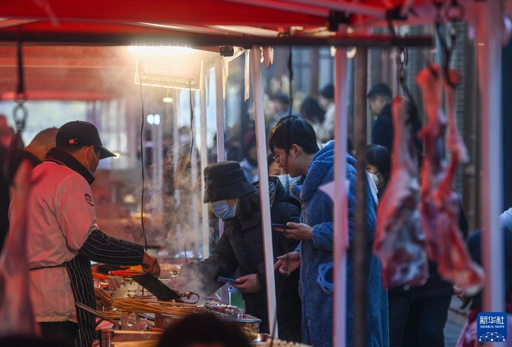 1月11日,人們在杭州市余杭區瓶窯鎮瓶窯老街年貨節上品嘗特色小吃。