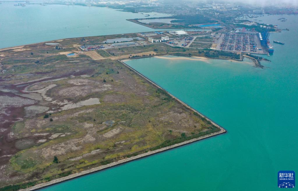 這是1月11日拍攝的海南洋浦區域國際集裝箱樞紐港擴建工程所在地(無(wú)人機照片)。