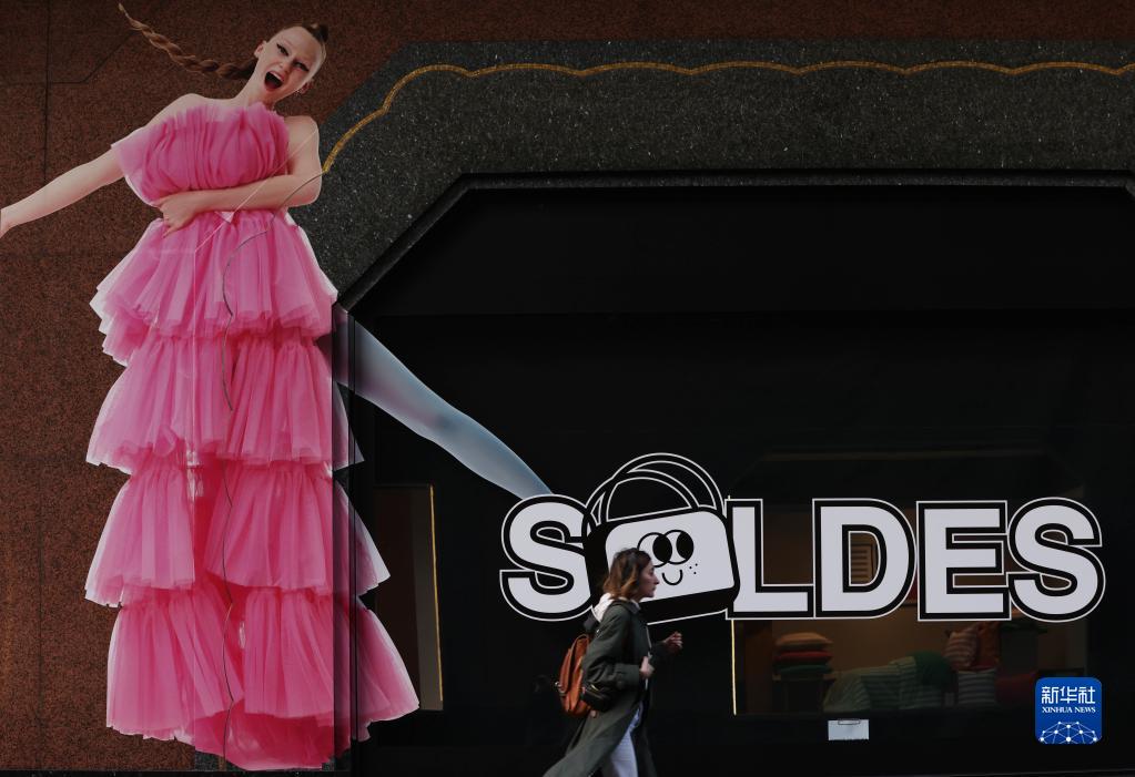 1月11日,一名女子走過(guò)法國巴黎街頭的打折季廣告。
