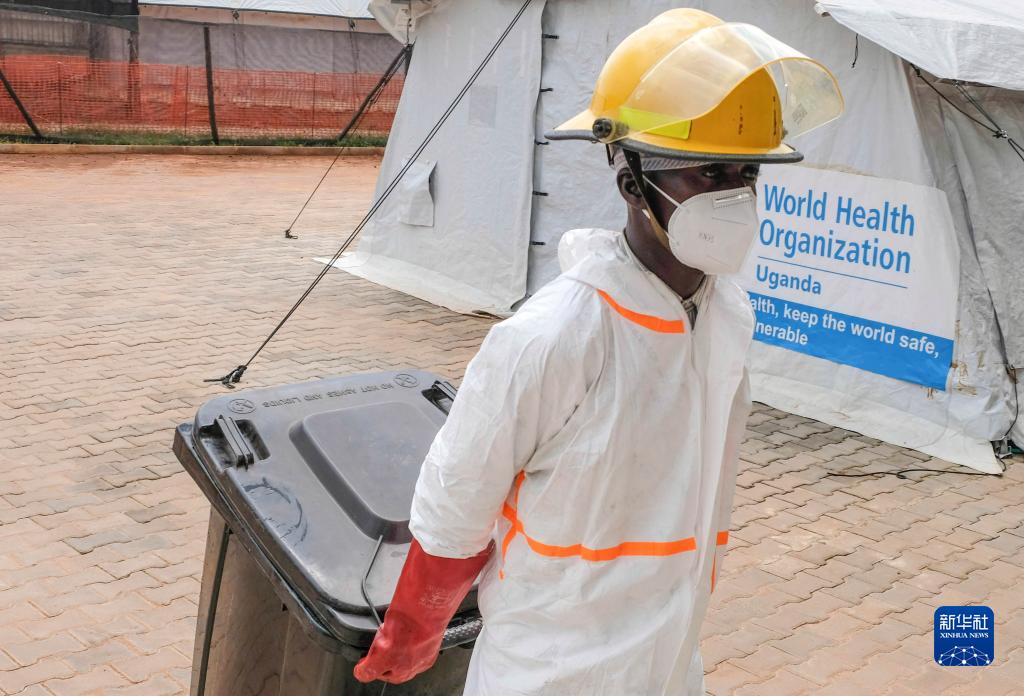 1月11日,在烏干達中部地區穆本德,一名清潔工人拖著(zhù)垃圾箱走在埃博拉治療中心內。