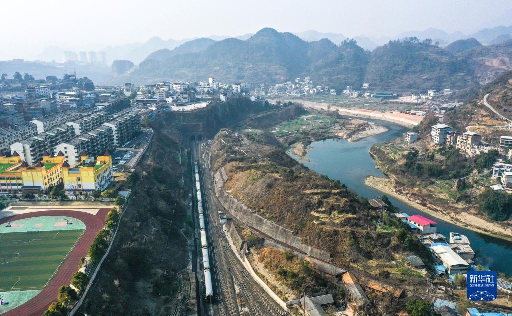 1月11日, 5640次列車(chē)從貴州凱里市附近駛過(guò)(無(wú)人機照片)。