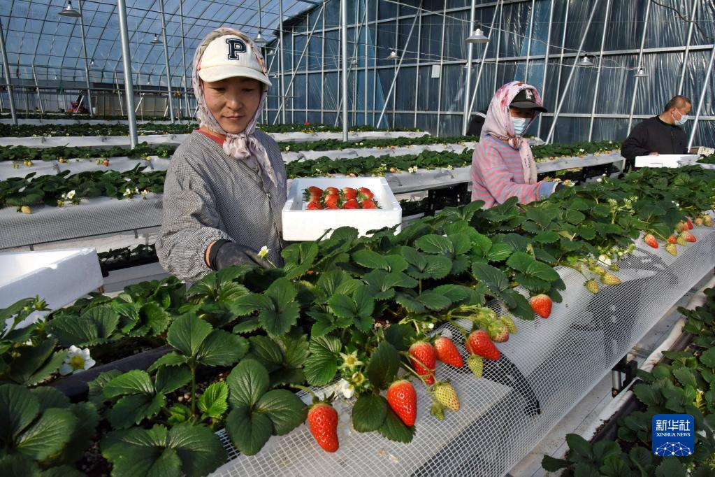 1月11日,山東省平度市舊店鎮東店子村村民在智能溫室采摘草莓。