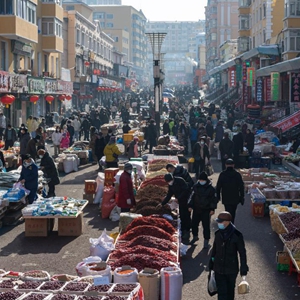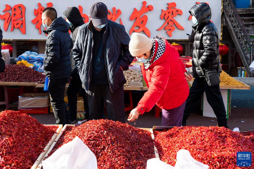 春節臨近,黑龍江省綏芬河市龍須溝步行街的年貨大集十分熱鬧。不少市民前來(lái)選購年貨,迎接新春的到來(lái)。