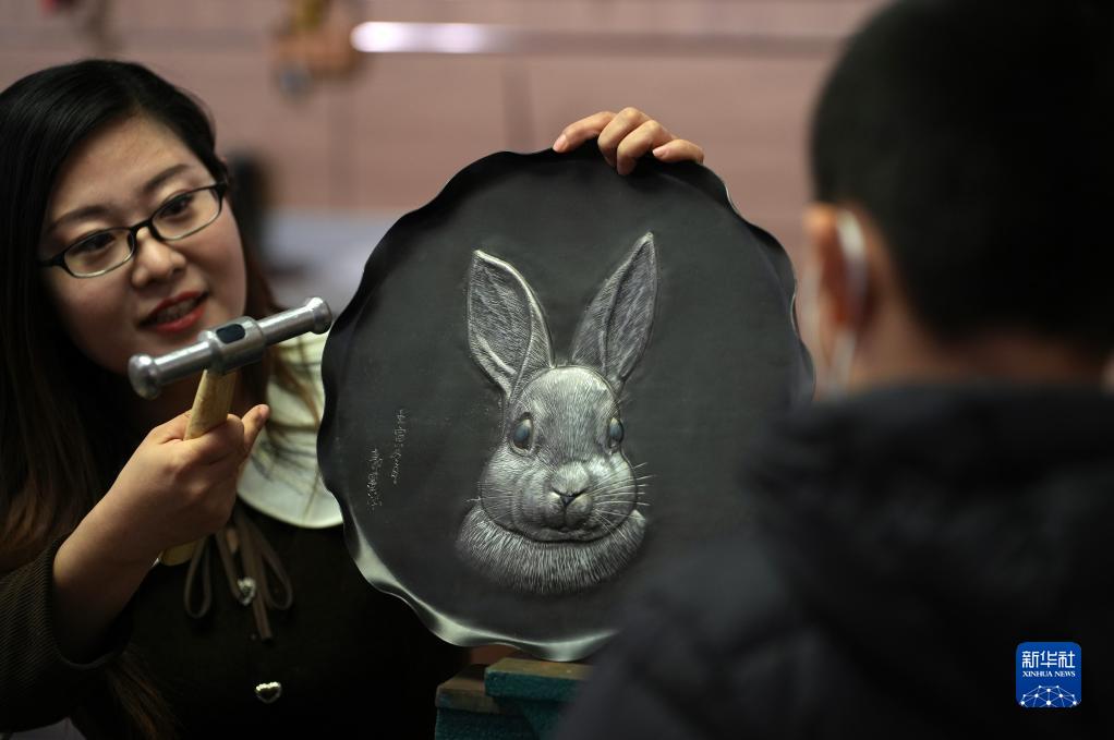 1月12日,在石家莊市新華區一個(gè)文化工作室,一名鐵板浮雕藝人向觀(guān)眾展示生肖兔作品。