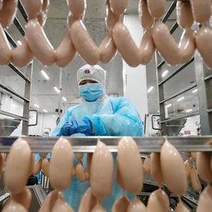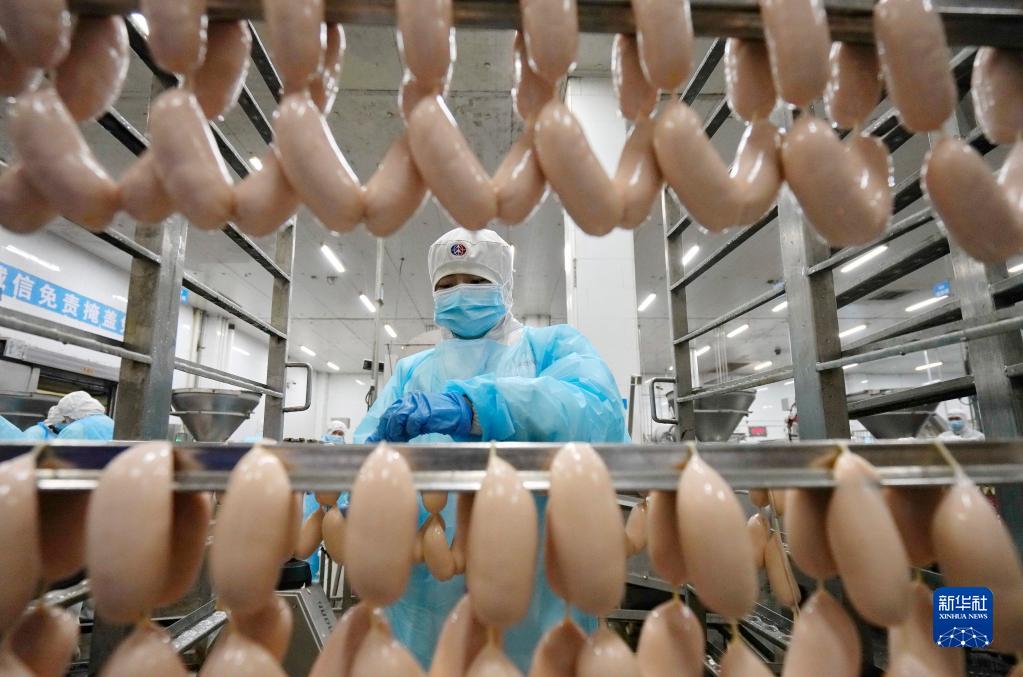 1月12日,工人在玉田縣一家火腿腸企業(yè)的生產(chǎn)車(chē)間工作。