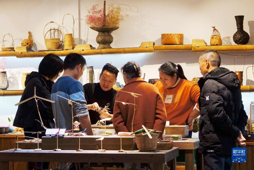 1月12日,福建武夷山竹編技藝傳承人謝宏星(左三)向顧客推薦自己的竹編產(chǎn)品。