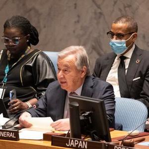 1月12日,在位于紐約的聯(lián)合國總部,聯(lián)合國秘書(shū)長(cháng)古特雷斯(前排中)在安理會(huì )關(guān)于加強國際法治問(wèn)題的公開(kāi)辯論會(huì )上發(fā)言。