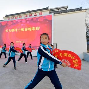 1月10日,在元古堆村村民廣場(chǎng),學(xué)生們在排練春晚的節目。