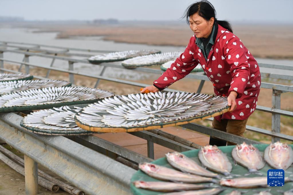 在岳陽(yáng)市君山區錢(qián)糧湖鎮六門(mén)閘社區生態(tài)漁村,居民在整理晾曬中的魚(yú)干(1月12日攝)。