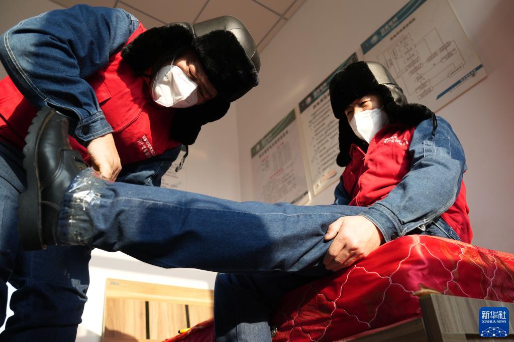 1月12日,國網(wǎng)撫遠市供電分公司抓吉供電所所長(cháng)白樺先(左)在幫著(zhù)工友費義偉用膠帶纏住褲腿,避免巡線(xiàn)時(shí)鞋里進(jìn)雪。