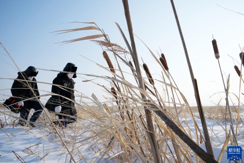 1月12日,國網(wǎng)撫遠市供電分公司抓吉供電所所長(cháng)白樺先(右)和工友費義偉在巡視東極線(xiàn)。