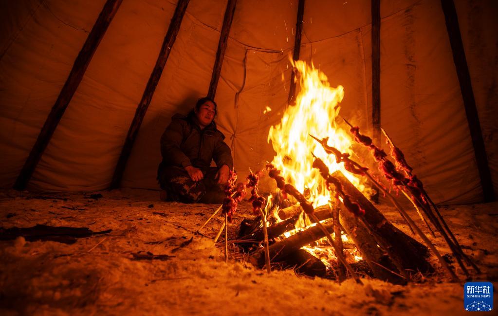 1月11日,覺(jué)樂(lè )的表弟達林瑪烹制鄂溫克傳統烤肉作為晚飯。新華社記者 費茂華 攝