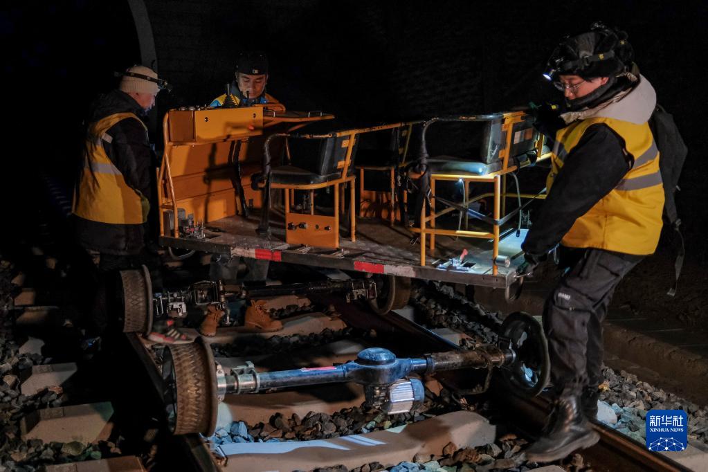 羅布和同事在拉林鐵路路軌上組裝雙軌式鋼軌超聲波探傷儀(1月12日攝)。
