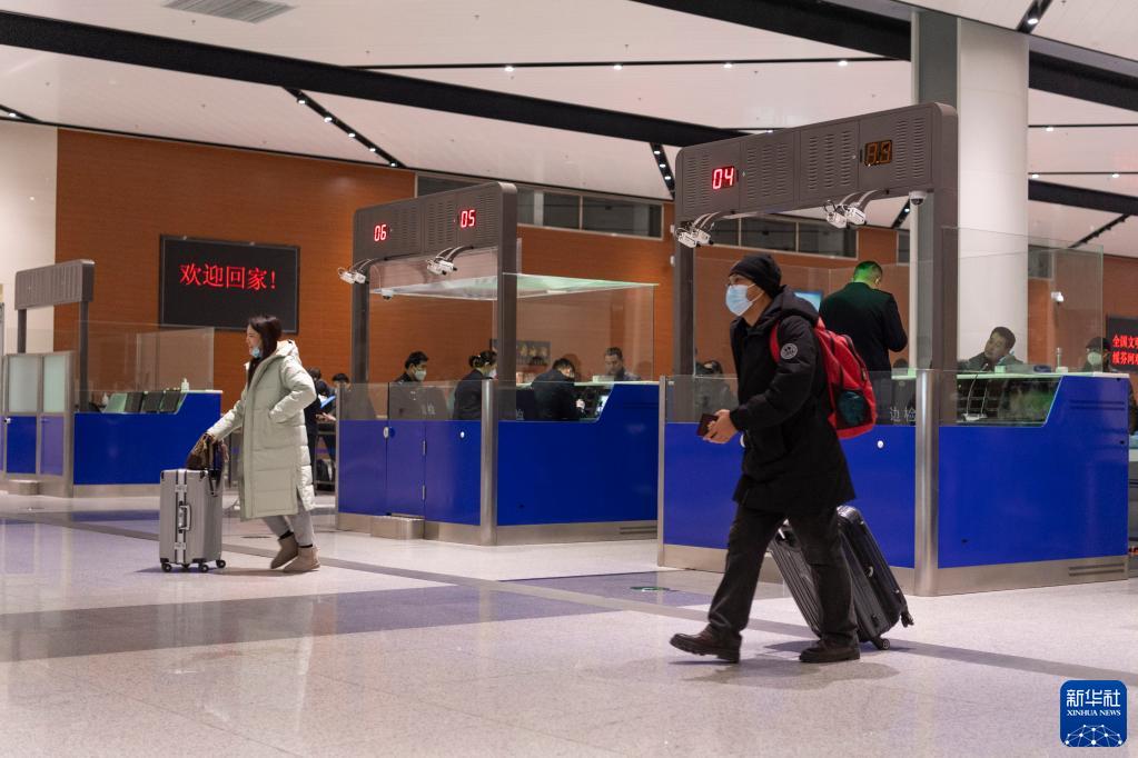 1月12日,在綏芬河公路口岸旅檢大廳,旅客辦理完通關(guān)手續入境。