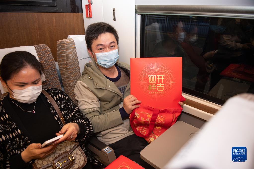 1月13日,搭乘愛(ài)心專(zhuān)列的旅客展示獲贈的福袋。